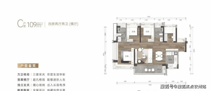 建筑面积约109㎡户型-4房2卫(横厅)