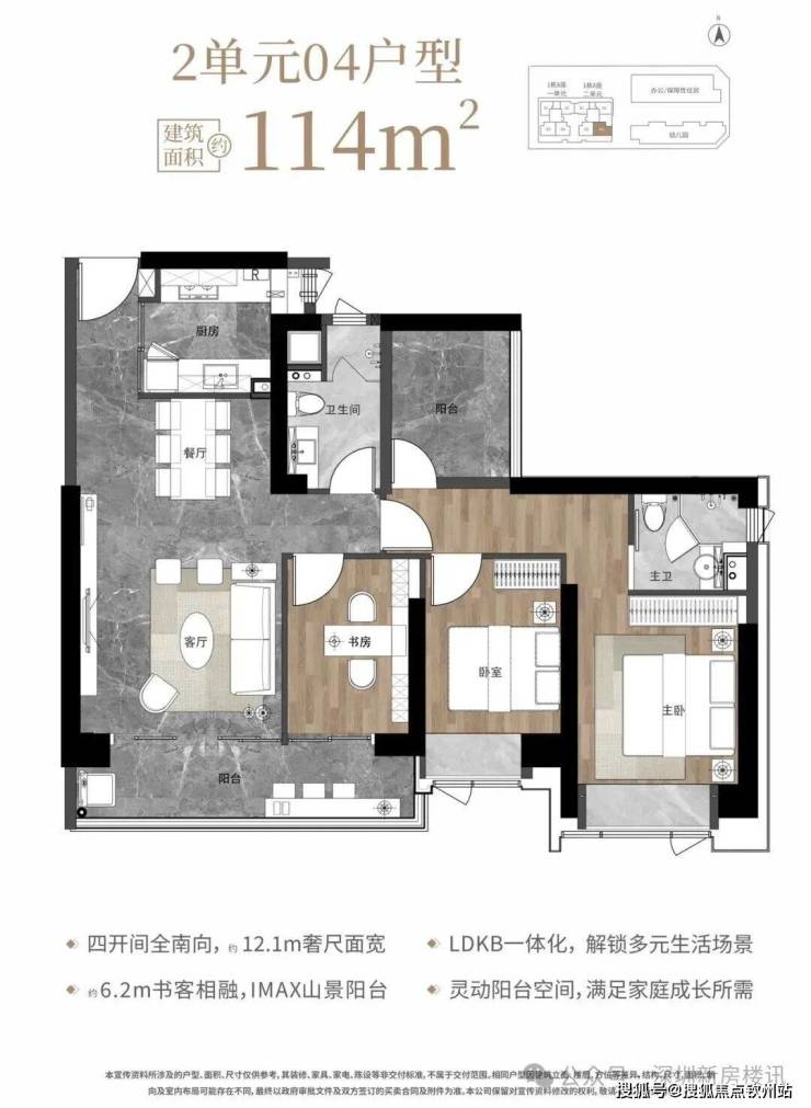 竖厅设计,主卧旁边“阳台”处、书房实际可以做一个房间,主卧套房设计,客餐厅一体,阳台连通客厅和书房,宽敞实用。