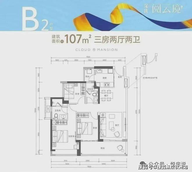 107㎡的3房2厅2卫(B2户型,1栋4单元03/04户型)设计的是竖厅格局,进门独立玄关,客厅3.5米开间,LDKB一体化设计,动静分区,3个卧室分别做到了3.15米/3米/2.5米的宽度,客厅连接次卧出5.9米长的大阳台,二字型厨房还带1个小生活阳台。