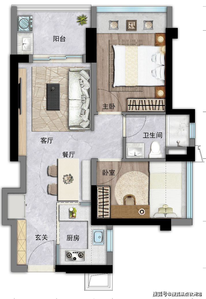 63㎡的2房2厅1卫,设计的是竖厅格局,进门入户玄关,客厅3米开间,LDKB一体化,S墙设计预留冰箱位,2个卧室分别做到了2.8米/2.35米的宽度,U型厨房,卫生间干湿分离,得房率约:88%(包含赠送),阳台西北朝向