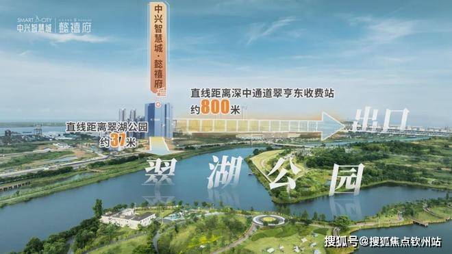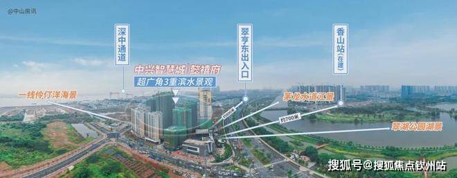 项目距深中通道翠亨东出入口约800米,紧邻建设中的南中城际香山站。南中城际香山站与项目楼下的翠湖公园组成“一湖一站”的TOD综合体。