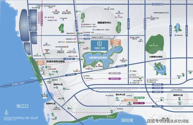 中粮大洋开发区:立新湖位于宝安北部核心地带,紧邻宝安大道和107国道,近深圳宝安国际机场和国际会展中心、机场东枢纽,和凤凰山森林公园、福永河共同构成宝安山海连城的主要廊道,是“黄金内湾”的“流量入口”,也是大湾区具有独特空间价值的区域。