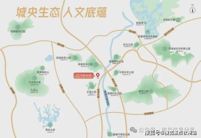 项目周边汇集五大公园,观澜湖生态体育公园(运营)、观澜民法公园、观澜体育公园(在建)、观澜河湿地公园、长湖公园(规划)及茜坑水库。