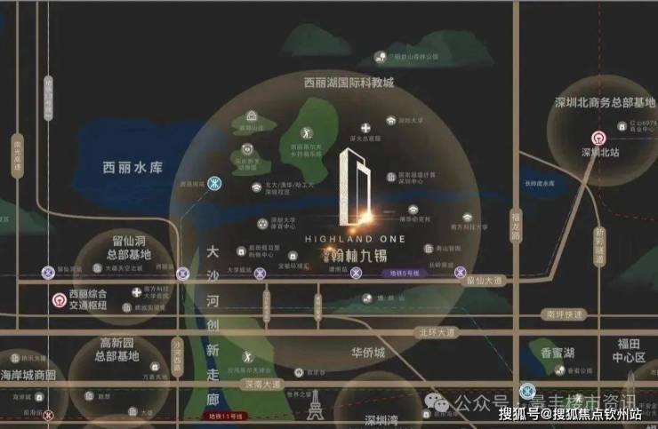 留仙大道正席,紧邻地铁5号线塘朗站,4/5/7号线3轨环绕,毗邻“三纵五横”主干道,瞬息通达全城。西丽高铁站(建设中)、深圳北站两大枢纽环绕,拥有世界交通能级。