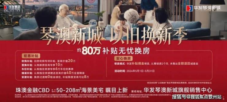 国企华发深耕珠海44载,深刻洞悉本土居者的置换需求,让每一位购房者安心换购。“琴澳新城以旧换新季”,承诺实实在在的福利大回馈,至高补贴约80万,为美好人居全面赋能,以旧换新置业正当时。