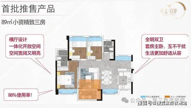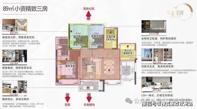 其中1、2、3、5、7栋,为18层高的小高层住宅,两梯五户设计,打造有两种产品,分别为75㎡东南向三房和89㎡三房两厅两卫(横厅设计)。
