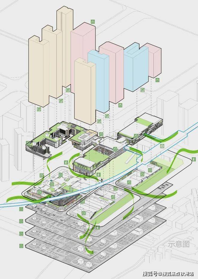 垂直交通场景:多首层设计,空中连板、无风雨连廊等,形成住宅、商业、办公与地面公交、空中地铁的接驳体系。