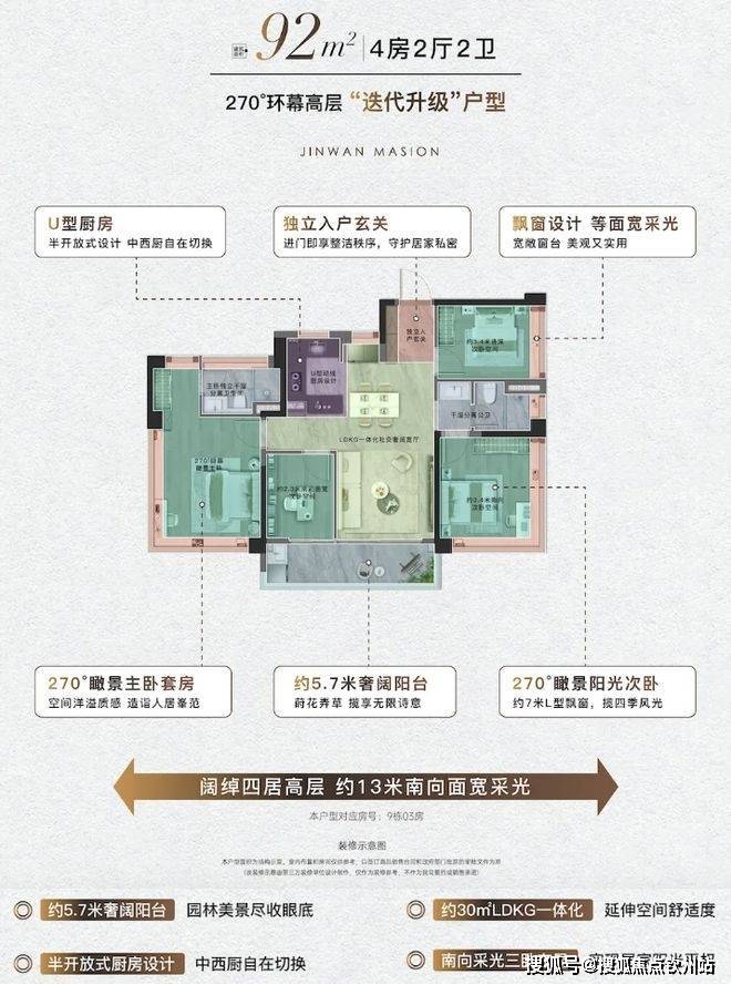 约92㎡(03户型),拥有约13米南向面宽,主卧及南向次卧均享270°广角飘窗,采光视野极佳,双重无界享受。