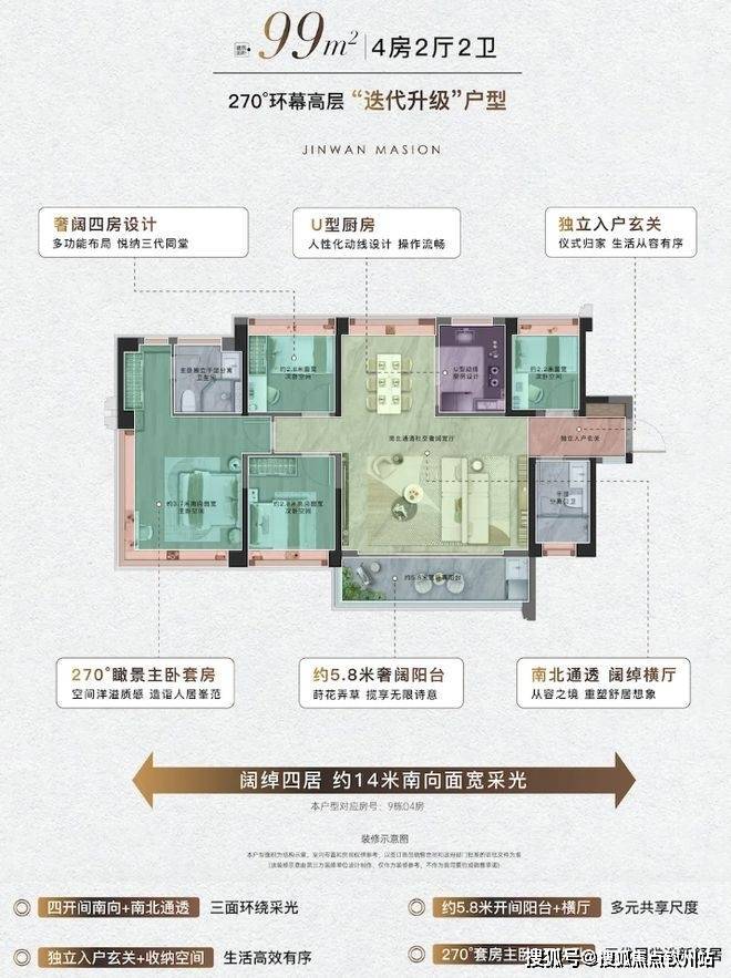 约99㎡户型(04户型),同样以全飘窗、270°瞰景主卧、阔景阳台为核心亮点。