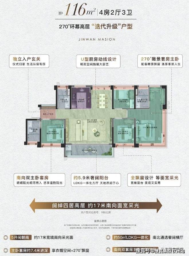 约116㎡(02户型),以约17米南向面宽和南向双套房设计,定义了同面积段产品的奢适新标准。