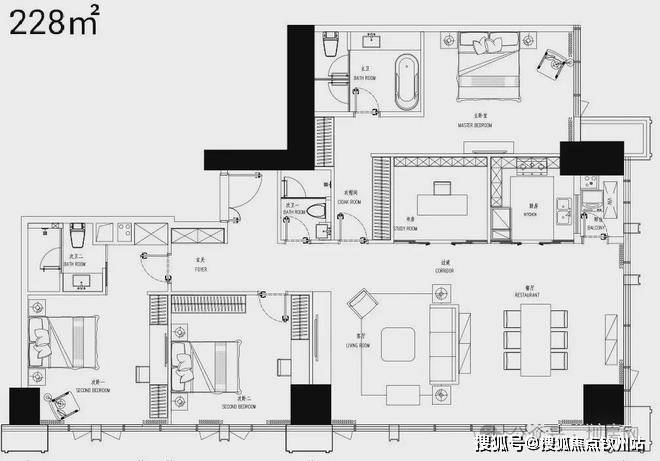 【办公体】:办公和商业空间灰色气质,办公楼折线开口设计使大面积的玻璃立面生动活泼且具有现代感;竖线条更加突显建筑的高耸挺立。
