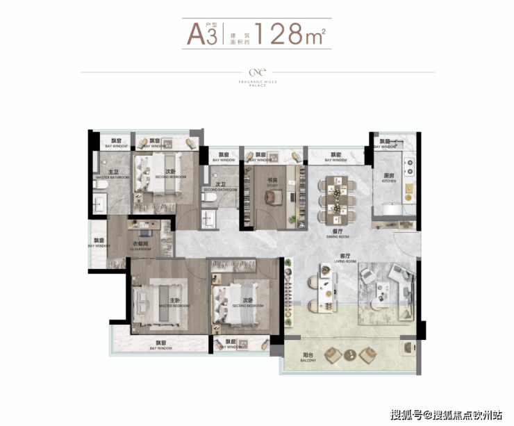 亮点:三开间朝南主卧,270°飘窗设计,最大化赠送