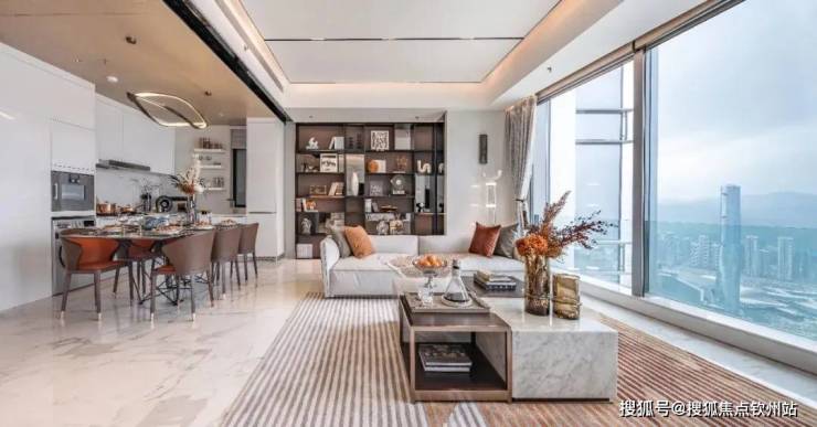 185㎡戶型,以摩登風格為基調,在配色上運用大量的黑白灰關係做層次遞進,塑造承載當代都市生活的自由空間。 在空間的整體規劃上,解放了廚房的空間,打開了整個空間佈局,擴大空間視覺感受。超9米巨幕落地窗配以3.6米的奢闊層高,270度俯瞰雙城盛景,視覺突破傳統的禁錮,向外無限延展。