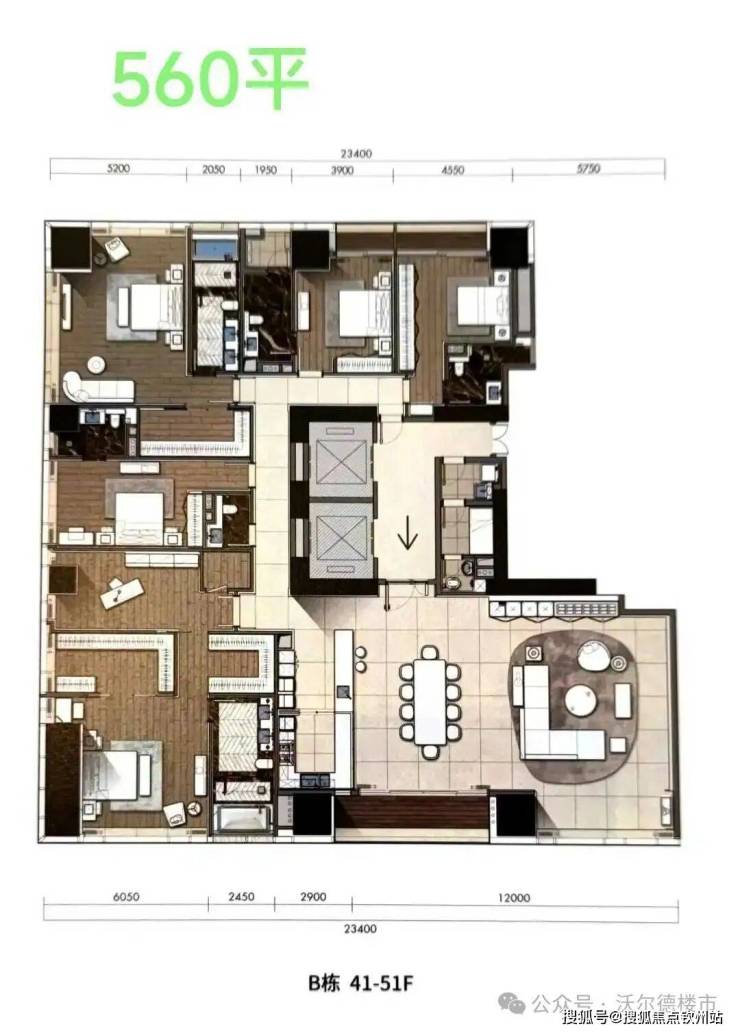D2户型:约340㎡4房2厅4卫:B栋28-52F(高区),东朝向,户型与343㎡户型基本相同。