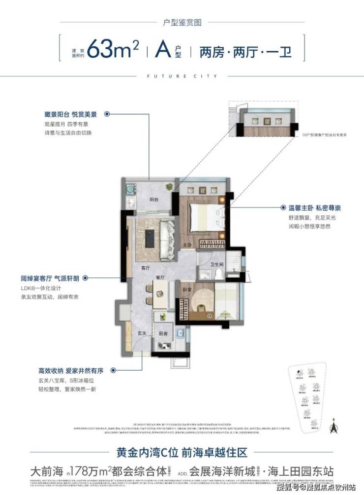作为前海第一个新规项目,结合当前市场环境和客户置业心理,增加了63㎡王炸2房产品线,作为此次加推的爆款噱头,实现了市场、渠道、客户的快速聚焦,重新定义前海上车门槛,对同片区小户型进行了降维打击,树立了“年轻首置首选、全市刚需必看”的市场认知。