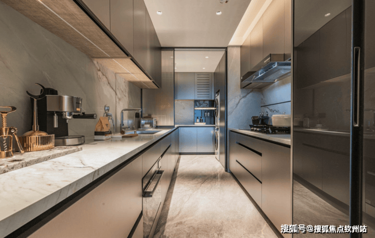 类似的细节还有很多,比如在玄关处,预留了做整墙定制柜空间,一旁还配备了独立储藏间,小到生活用品,大到行李箱,乃至家人爱好的高尔夫杆、冲浪板等,通通都能塞入。在中厨尽头处则设置了一个家政仓,预留好上下水,可放置洗烘分体机,还能收纳洗地机、吸尘器等,另外家政间配置有操作台面,便于洗衣服前后的整理或熨烫。
