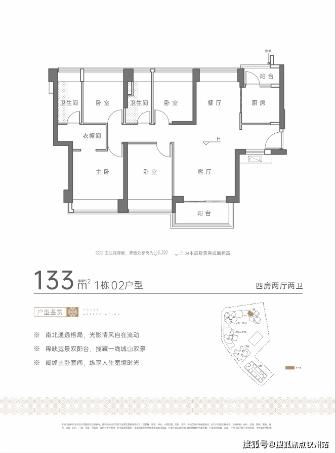 住宅由4栋48层建筑组成,分别是1栋、2栋1/2单元和3栋,3梯5/6户,4栋是商务公寓45F(1470户),5栋是幼儿园。