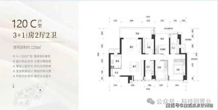 120㎡:客厅与卧室连通9.6㎡超大阳台,主卧带5.2㎡衣帽间,还有观景小阳台,主要为东南和西南朝向