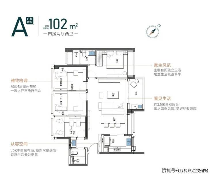 经典超大面宽的横厅户型,3.5米景观阳台,敞阔四房布局,三代同堂。