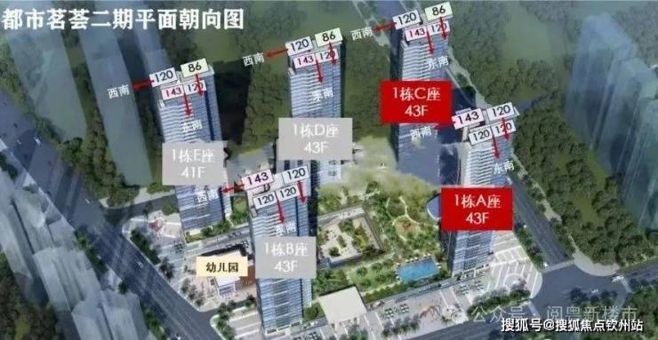 现在我们来看看今天的主角都市茗荟二期,项目在建高度约为43层,都市茗荟二期项目由6栋建筑主体组成,分为1栋ABCDE座和幼儿园,容积率3.89,规划停车位900个。