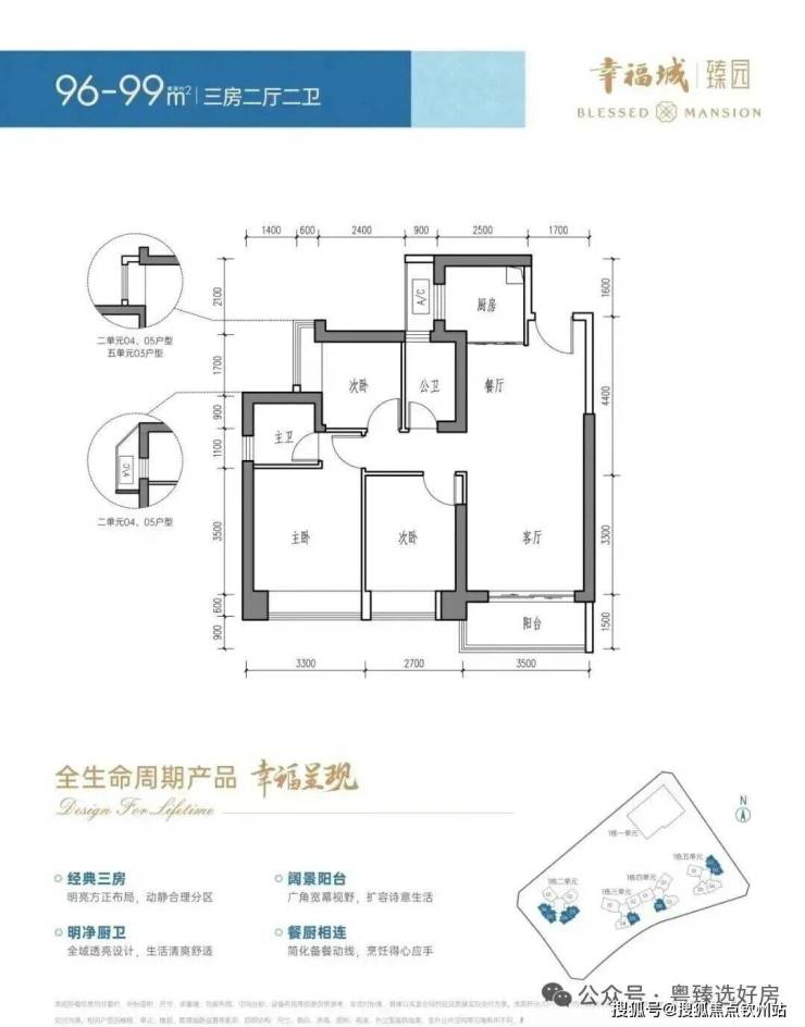 96-99㎡的3房2厅2卫,设计的是经典竖厅格局,客厅3.5米开间,LDKB一体化设计,动静分区,3个卧室分别做到了主卧14.63㎡/次卧11.07㎡/次卧7.26㎡(包含墙体飘窗),U型厨房,卫生间干湿分离,得房率约81-84%(包含赠送),东南/西南或东北朝向。