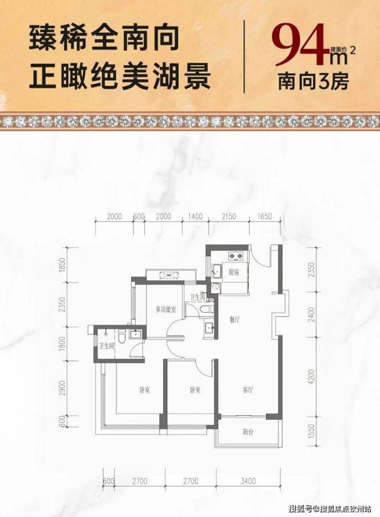 94㎡的3房2厅2卫,设计的是经典竖厅格局,客厅3.4米开间,LDKB一体化,S墙设计预留冰箱卡槽位,动静分区,三开间朝南,分别做到了主卧13.55㎡/次卧9.45㎡/次卧7.28㎡(包含墙体飘窗),U型厨房,公卫三段式干湿分离,得房率约74%(不含赠送),阳台东南朝向约5.27平。套内面积69.94㎡+赠送面积9.65㎡=实得面积79.59㎡,加上赠送后得房率约84.22%。