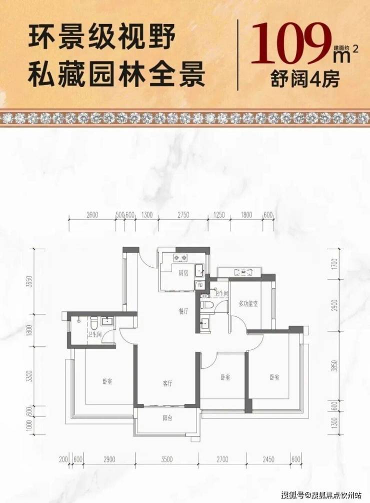 109㎡的4房2厅2卫,设计的是竖厅双龙抱珠格局,进门入户玄关,客厅3.5米开间,LDKB一体化,主卧270°无柱转角飘窗,分别做到了主卧15.45㎡/次卧13.57㎡/次卧9.31㎡/次卧6.96m²(包含墙体飘窗),U型厨房,公卫三段式干湿分离,得房率约74%(不含赠送),阳台西南朝向约5.95平。套内面积80.81㎡+赠送面积16.75㎡=实得面积97.56㎡,加上赠送后得房率约89.34%。
