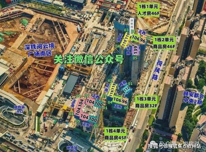 深铁阅云境广场,由深铁集团开发,总建筑面积约16万㎡,计容建筑面积约11.2万㎡,容积率6.1,绿化率40%,共由4栋总高32-46层的住宅组成,包含3栋商品房+1栋人才房,其中1栋1单元人才房46F,1栋2单元商品房46F,1栋3单元商品房32F,1栋4单元商品房45F。