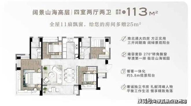 主卧室270°转角飘窗,景观视野开敞舒适;