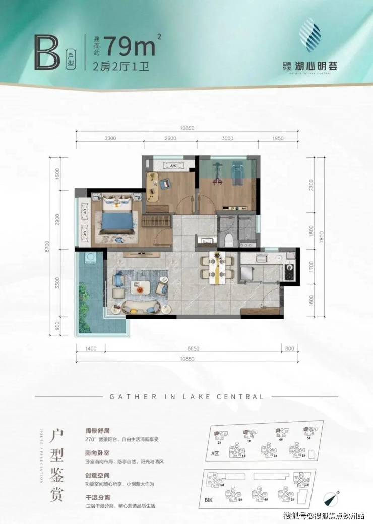 招商华发·湖心明荟,3室2厅1卫,建面79m²,南朝向,约86.5万/套。