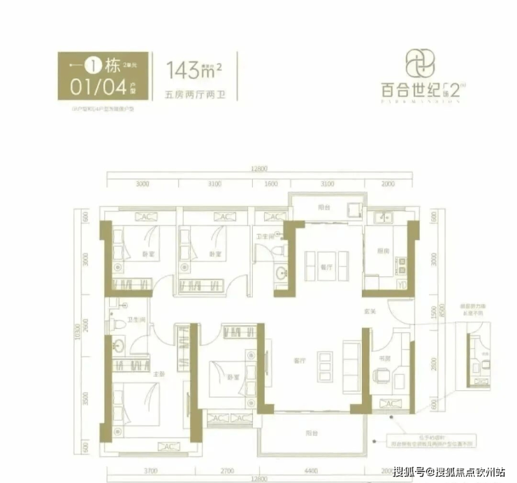 143㎡的5房2厅2卫,3栋1单元04/3栋2单元01户型,设计的是竖厅南北通透格局,进门入户玄关,客厅4.4米开间,客餐厅分离设计,南北双阳台,得房率约76%(不含赠送),阳台主朝西南或东南向。套内面积108.68㎡+赠送17.22㎡=实得125.9㎡,加上赠送得房率约88.04%。