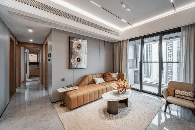 打通次卧与客厅,便打造出约7.4米南向环幕视野,空间尺度与视觉冲击远超部分横厅户型,抬头即揽城市巨幕风光。