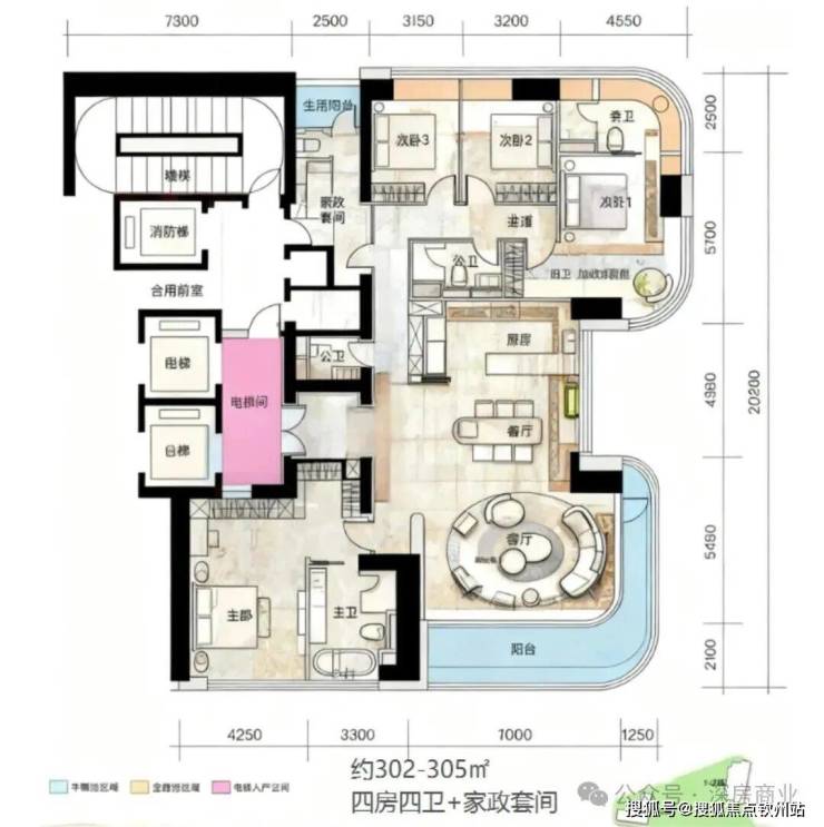 E栋 302㎡ 层高3.5 四房,西南、43层、3梯2户,80余套,
