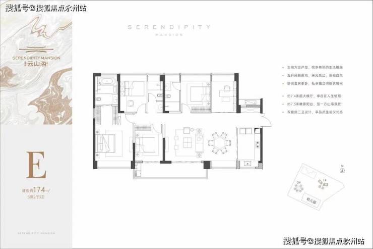 174㎡的5房2厅3卫,设计的是横厅南北通透格局,客餐厅7.4米开间,客厅连接次卧出7.3米长大阳台,五开间朝南,双套房设计,5个卧室分别为4米/3.2米/3米/2.9米/2.6米的宽度,U型厨房,公卫三段式分离,得房率:79.79%(不含赠送),阳台主朝西南向。