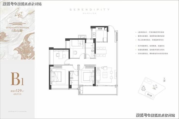 129㎡的4房2厅2卫,设计的是竖厅格局,客厅3.9米开间,客厅连接次卧出6.8米长大阳台,三开间朝南,4个卧室为3.5米/2.9米/2.9米/2.9米的宽度,U型厨房,得房率:79.79%(不含赠送),都是西南朝向。