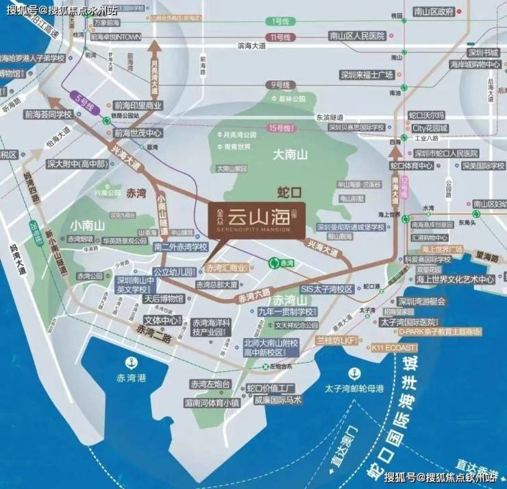 【金众云山海公馆】所处于南山赤湾片区,比较出名的可能就是赤湾港,西北侧毗邻前海中心,东北侧毗邻太子湾、蛇口中心,地段是可以的。家门口的地铁站,南二外集团的赤湾学校,还有准备运营的赤湾汇商业+蛇口太子湾的高端商业,该有的配套都有。