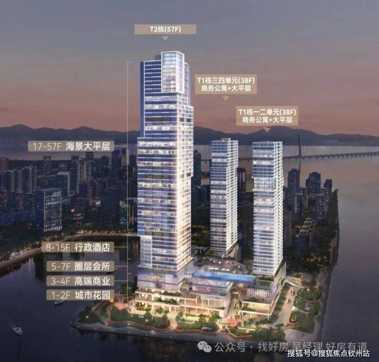 项目分两期开发,主要由3栋高层建筑组成,将建设成集滨海休闲、精品酒店、特色商业、办公、公寓于一体的滨海商业综合体。