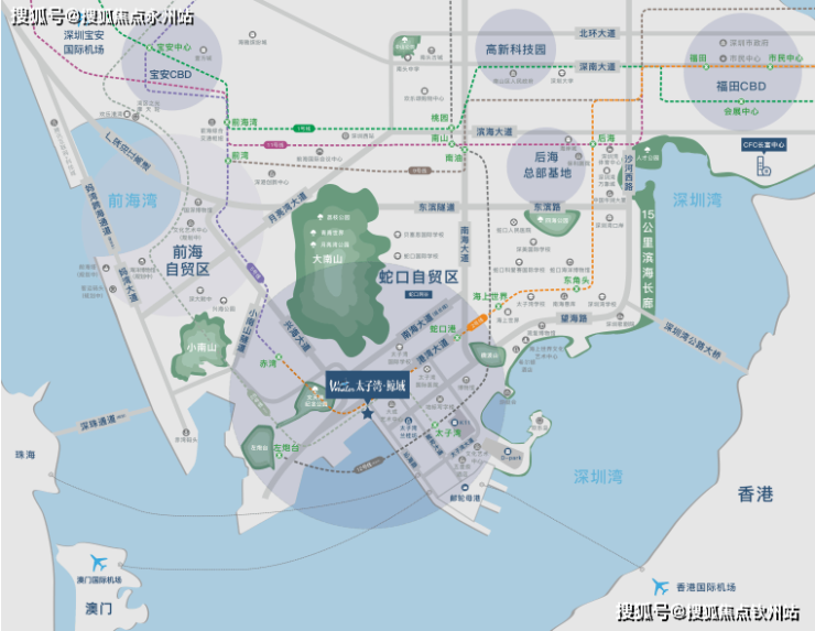 轨:地铁2号线(蛇口港站660米)、地铁5号线(赤湾站1.6公里)、地铁12号线(太子湾站200米)、地铁28号线(规划中),轨道交通便利。