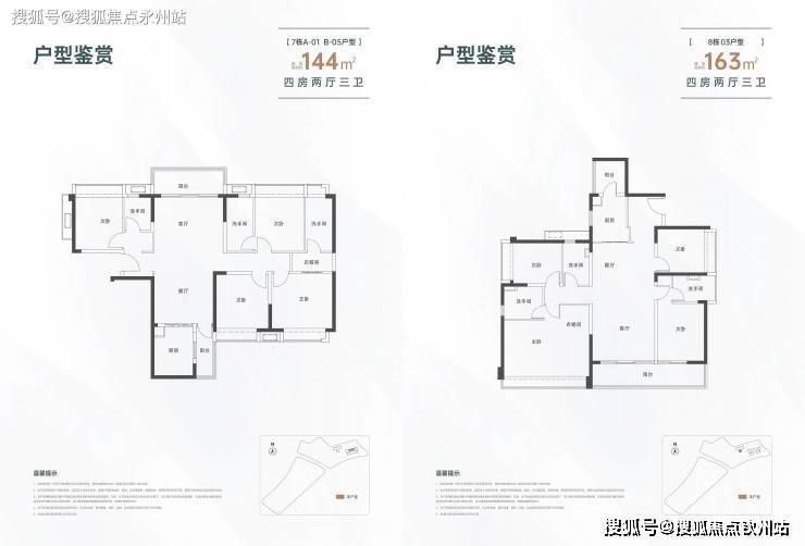 144-163㎡四房三卫(改善型)面积与配置:144㎡(南北通透)、163㎡(一梯一户)。