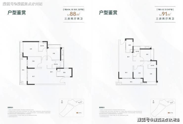 88-91㎡三房两卫(刚需型)两种相近面积段。