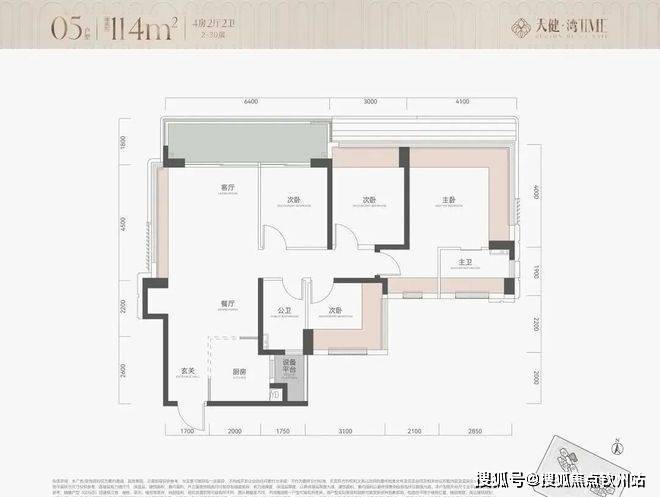 114㎡4房2卫,竖厅户型,朝北对着金众,户型结构和113完全一样,就是客厅也做了一面4.5米宽的凸窗;