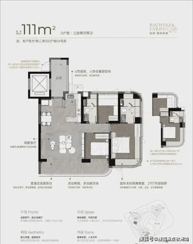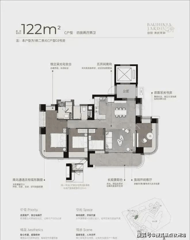双龙抱珠户型,整个户型非常通透。书房分布于客厅另一侧,难得的双面采光+270°景观视野。主卧南北通透,景观面开阔。