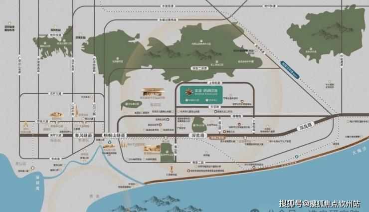 北倚深圳梧桐山,南临约19.5公里海滨栈道,坐拥山海双景。项目位于盐田区"一核四区"空间布局中的"一核引领"区域,即沙头角跨境免税消费核,是盐田区城市更新战略的重点项目之一。根据盐田区"十四五"规划,沙头角深港国际旅游消费合作区总面积约26平方公里,以"一核引领、四区联动"为空间发展架构,美盛梧桐印海正处于这一战略规划的核心位置。