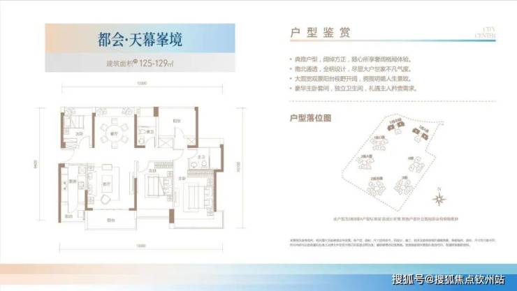 129㎡的4房2厅2卫,设计的是竖厅南北通透格局,三开间朝南,全屋飘窗设计,厨房带1个小生活阳台,卫生间干湿分离,阳台主朝西南及东南向,看花园景观。