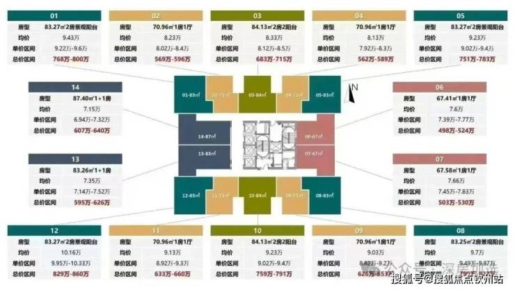 面积为67-71㎡1房卫,83-87㎡2房1卫,位于29-42F,5梯14户。