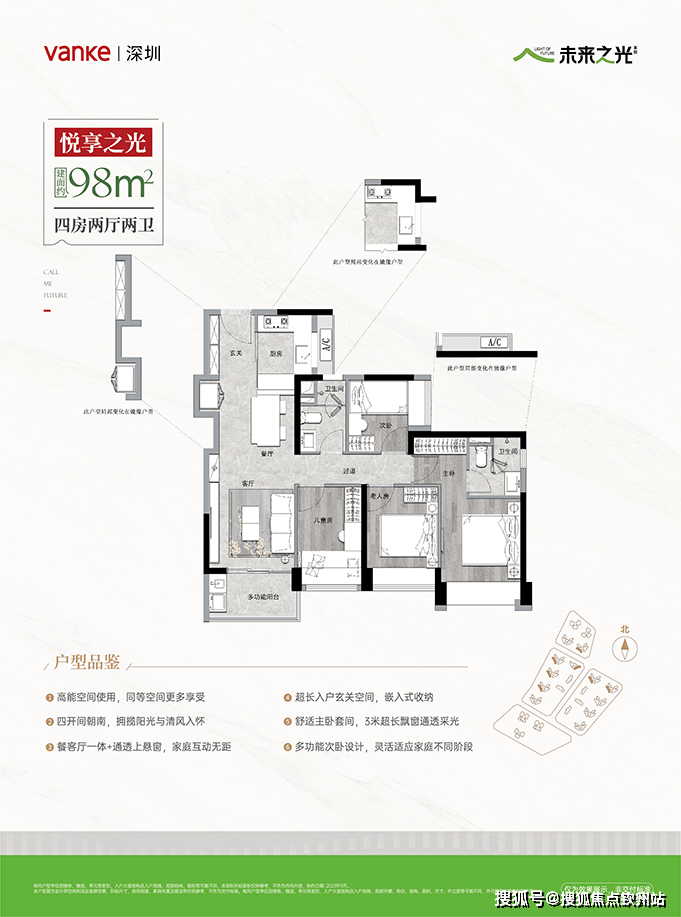 南北对流大竖厅,全明格局。主卧南北通透,独享私密空间。全屋景观飘窗,得房率约90%。同等空间双卫配置,早高峰不排队。