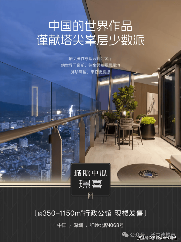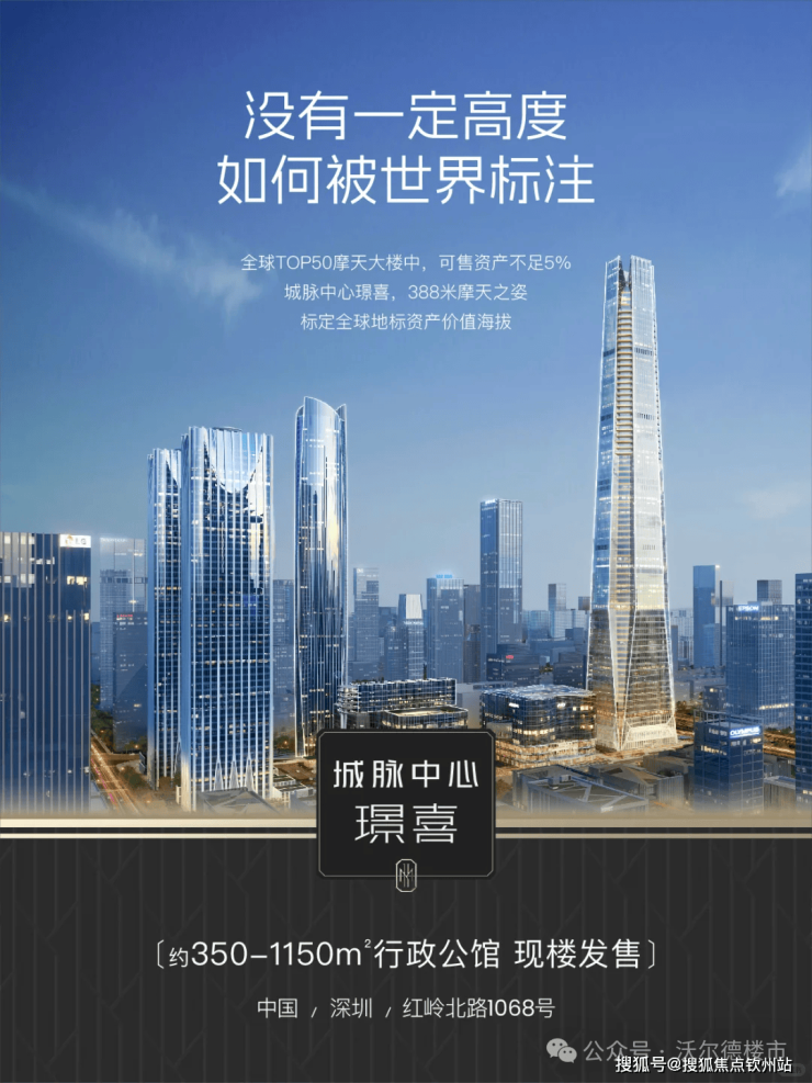 当摩天资产成为国际流通的“价值护照" 世界塔尖的目光,正聚焦中国。 ◆ 全球地标 天际资产◆ 388米深圳天际线地标 城脉中心·璟喜 正以中国资产的世界叙事 重构全球财富坐标 ◆ 超级区位底盘◆ 深圳黄金中轴、世界级金融街之上 福田、罗湖、香港三区资源中心 立足百万方城脉汇的高端商圈配套 铸就璟喜不可复制的资源王座 ◆总裁级行政公馆 ◆ SCDA&CCD双大师设计大平层 户户自带40㎡私人观景台 不仅是纯粹的空间占有 更总裁是对话世界的云端会客厅 匹配全球资产买家眼界与品味