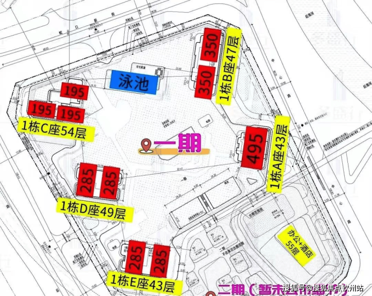 :计容建面15.6万㎡,共419套,含195㎡、285㎡、350㎡、495㎡四大户型,层高43-54层,梯户比最高达3梯1户(顶豪专享)。
