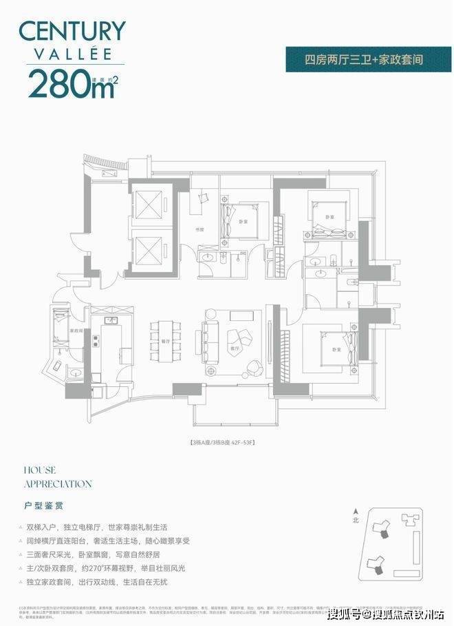 约233㎡3+1房3卫 A户型,西北朝向看名商和沙河高尔夫;