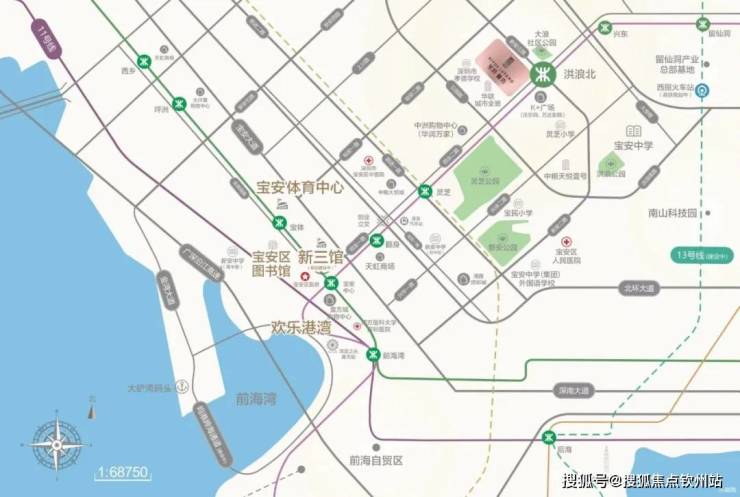 临靠5号线洪浪北地铁站D出口,向南3站到达宝安中心站,6站到达前海湾站,向北2站到达留仙洞总部基地,7站到达深圳北站;15号线(规划中),联通大铲湾、南山西丽和科技园片区。